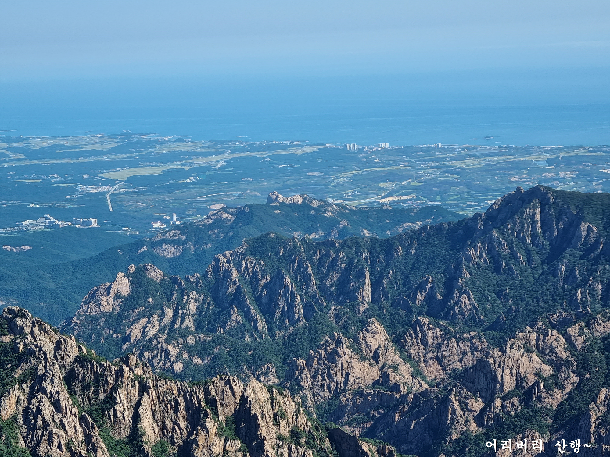 동해바다와 오른쪽에 뾰족한 칠성봉 가운데 벌래 같이 생긴 게 달마봉이고 오른쪽 앞에는 케이블카를 타고 올라갈 수