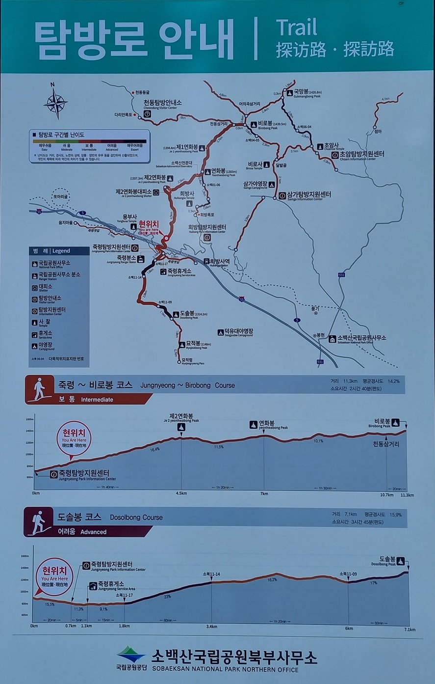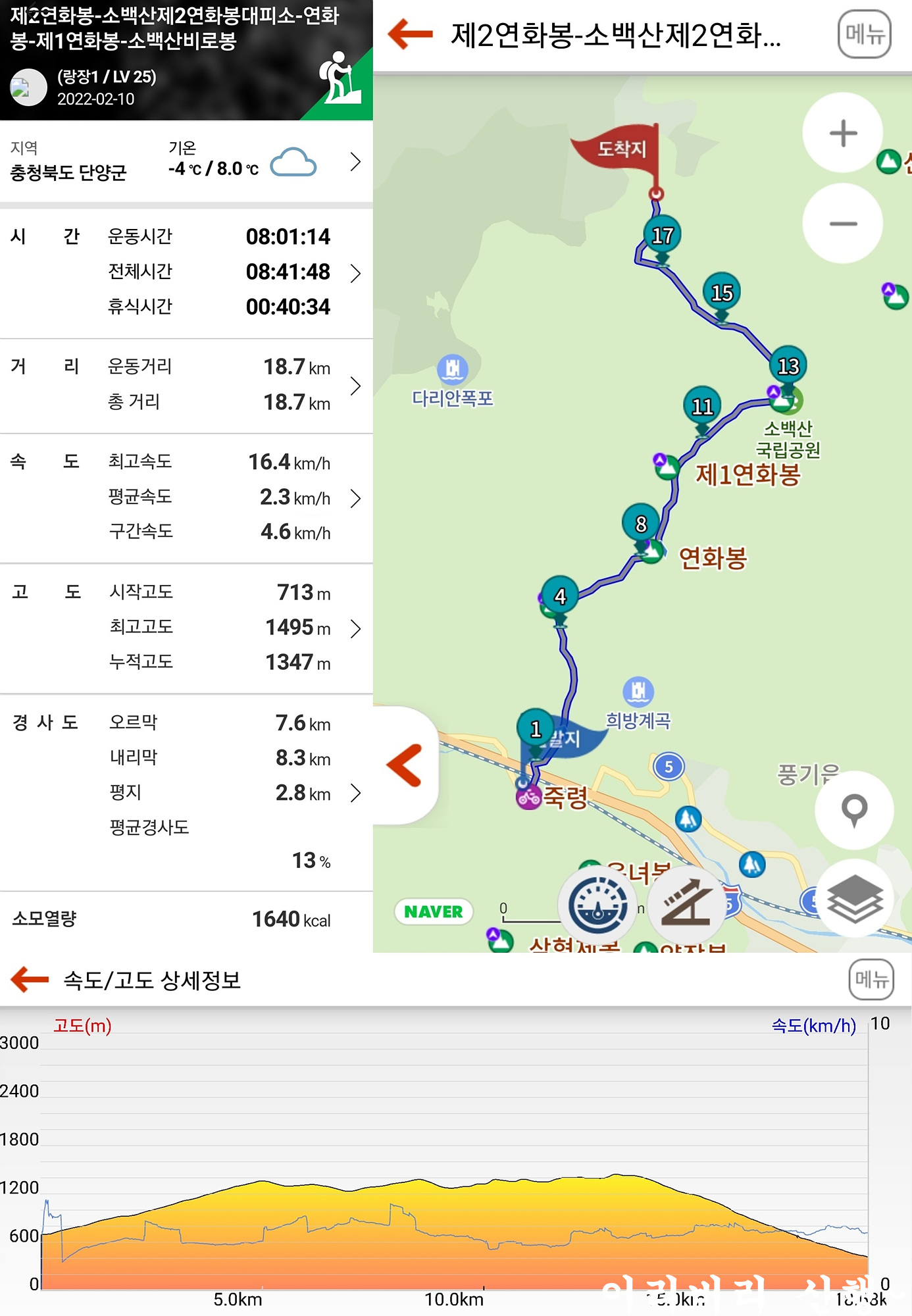 시멘트 포장길 7km중에 1연하봉까지의 거리는 약 5km 이고 탐방안내 고도표에도 있듯이 죽령이 해발고도 696m