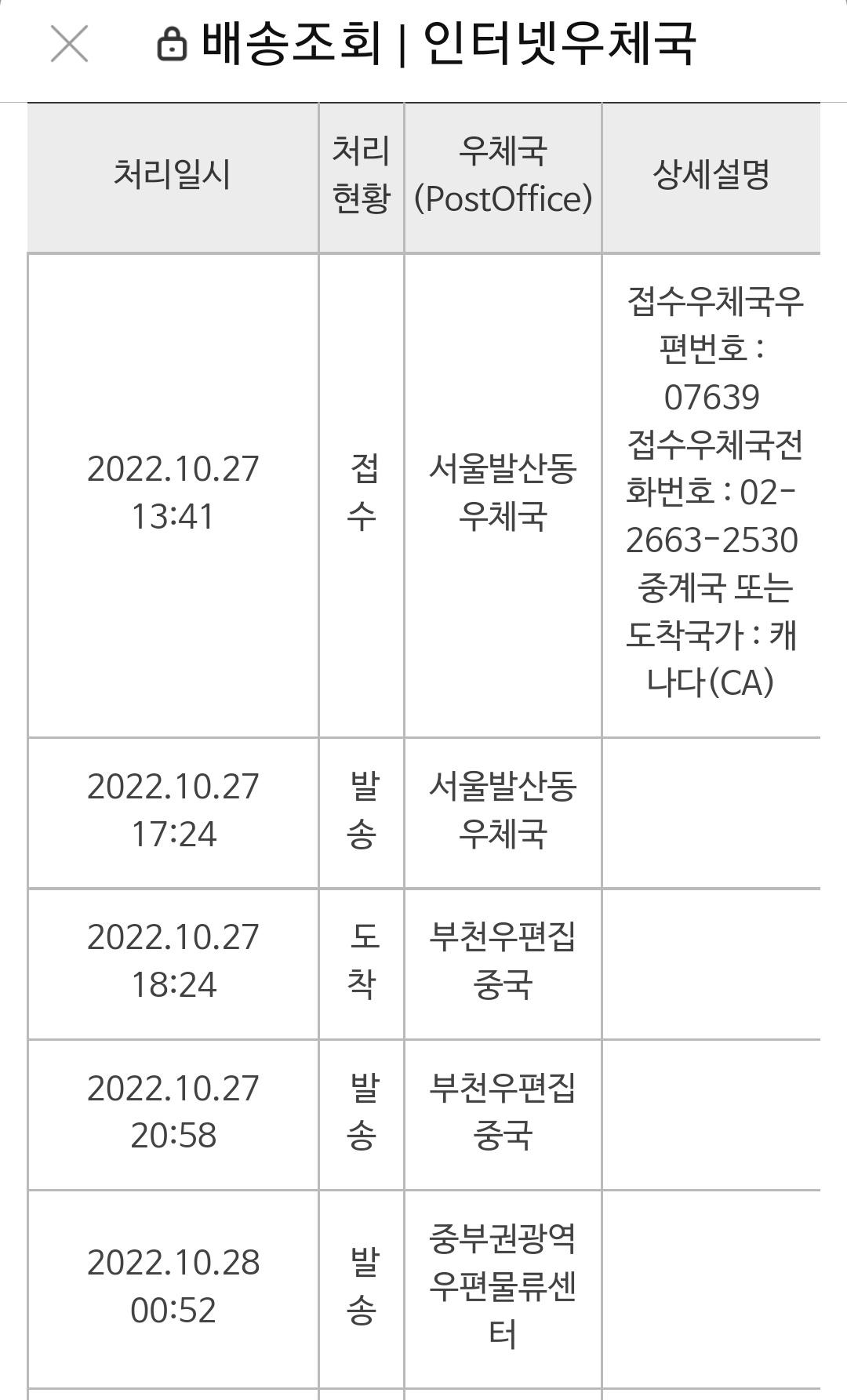 그러고 캐나다 우체국에 들어가서 검색을 하면 며칠 동안 지난 정보만 계속 나오다가 어느 날에