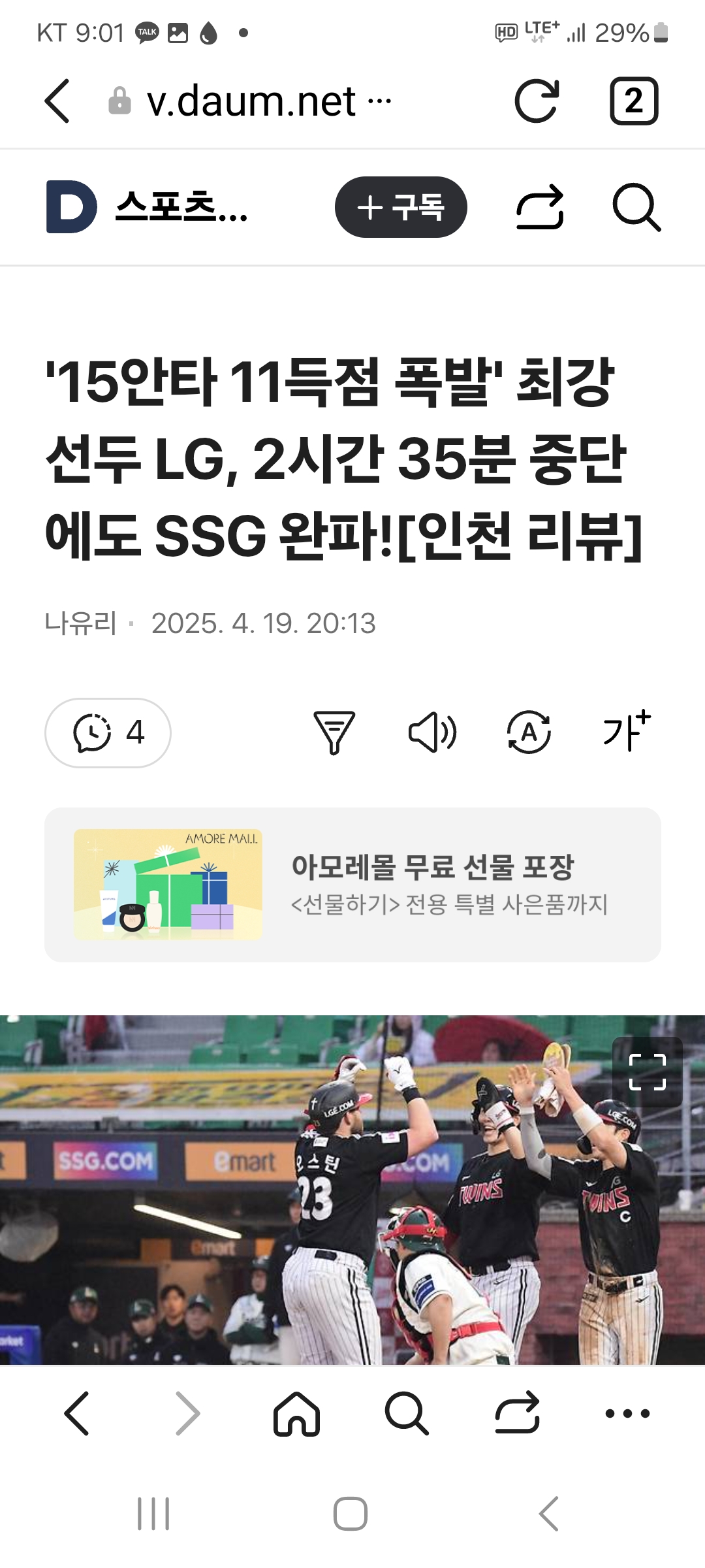 4월 19일(토) 문학 경기장 엘지 11: 4 ssg
