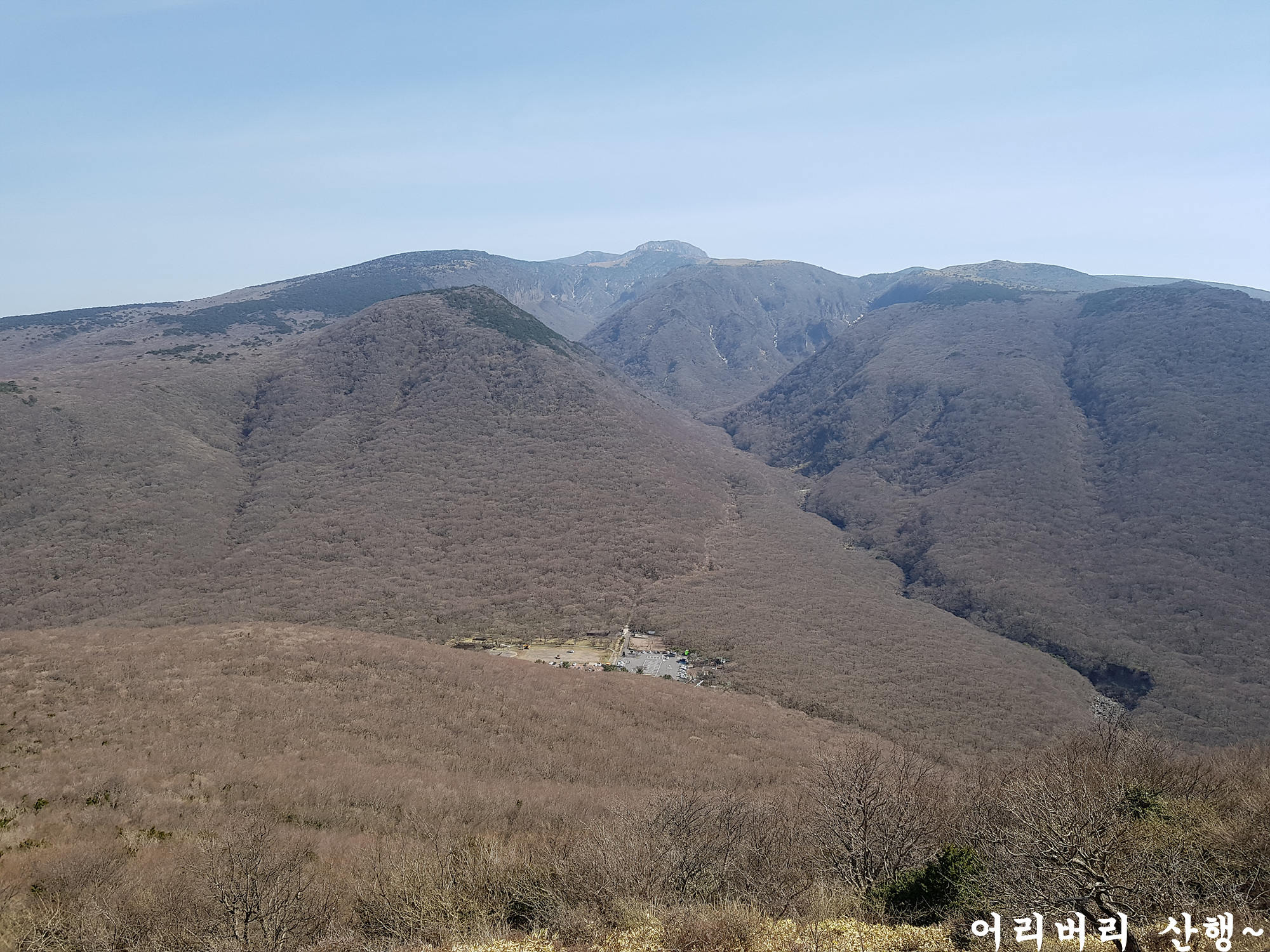 아랫쪽엔 어리목주차장이 있고 위로는 만세동산과 사제비동산,윗새오름이 보이고 남벽...